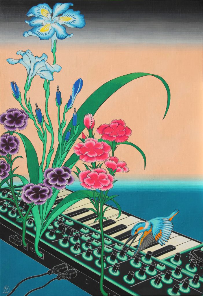 Kadenzu Synthesizer with Kingfisher and Flowers, 2025, acrylic on canvas, 26.6” x 19.7”