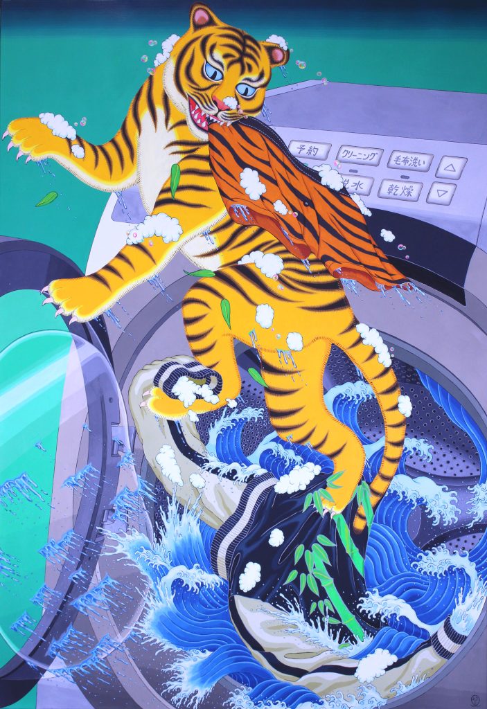 Kadenzu A Tiger Escaping from a Drum-type, Washing Machine, 2025, acrylic on canvas, 63.8” x 44.1”